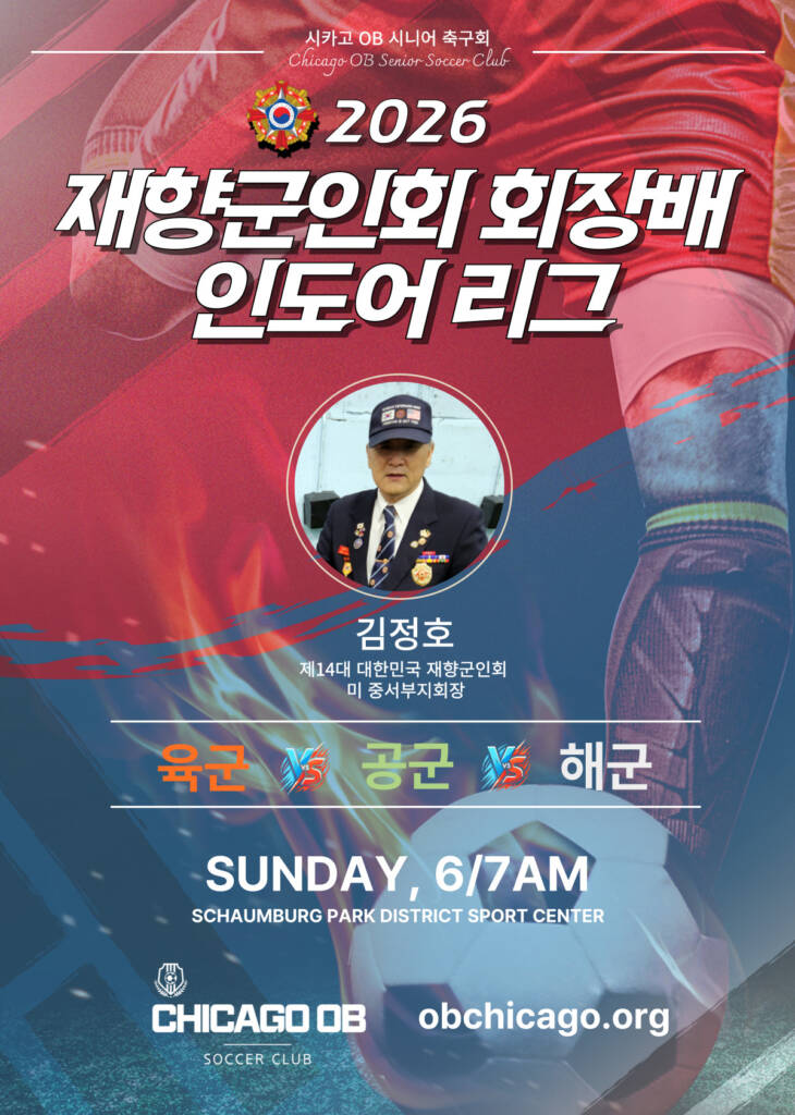 시카고 OB 시니어 축구회 Chicago OB Senior Soccer Club OB팀 소개공식 유니폼리그일정선수소개문의 2026 재향군인회 회장배 인도어리그 리그 일정 ” 시카고 OB 시니어 축구회의 후원에 관심이 있으신 분은 언제든지 연락주시기 바랍니다.” 문의